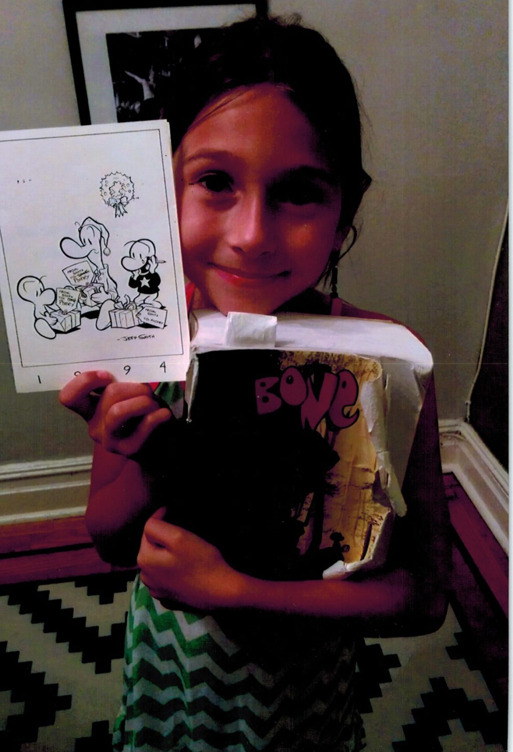 Our fan Gwen, and her well-worn BONE book and Dad’s saved Christmas card
