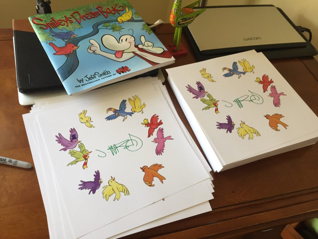 Signing special bookplates for Smiley’s Dream Book, Jeff’s first picture book starring the Bones! Coming in July from Scholastic/ Graphix.