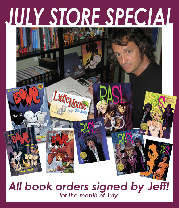 July Store Special Alert: All books purchased on boneville.com will be signed and autographed by Jeff! Get something special for yourself or the Bone/RASL/ TUKI fan in your life today!