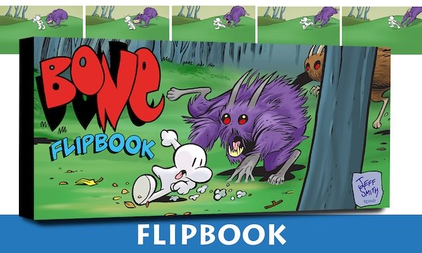 A colored, oversized (6” x 3”) update to the original flipbook released in 1994, features a scene right out of The Great Cow Race animated by the great Disney animator and Director Tom Bancroft, with clean up drawings by famed Monsters Bewaregraphic novelist Raphael Rosado. The flipbook has now been colored for the first time by Tom Gaadt! Watch the Stupid Rat Creature chase Fone Bone over and over!