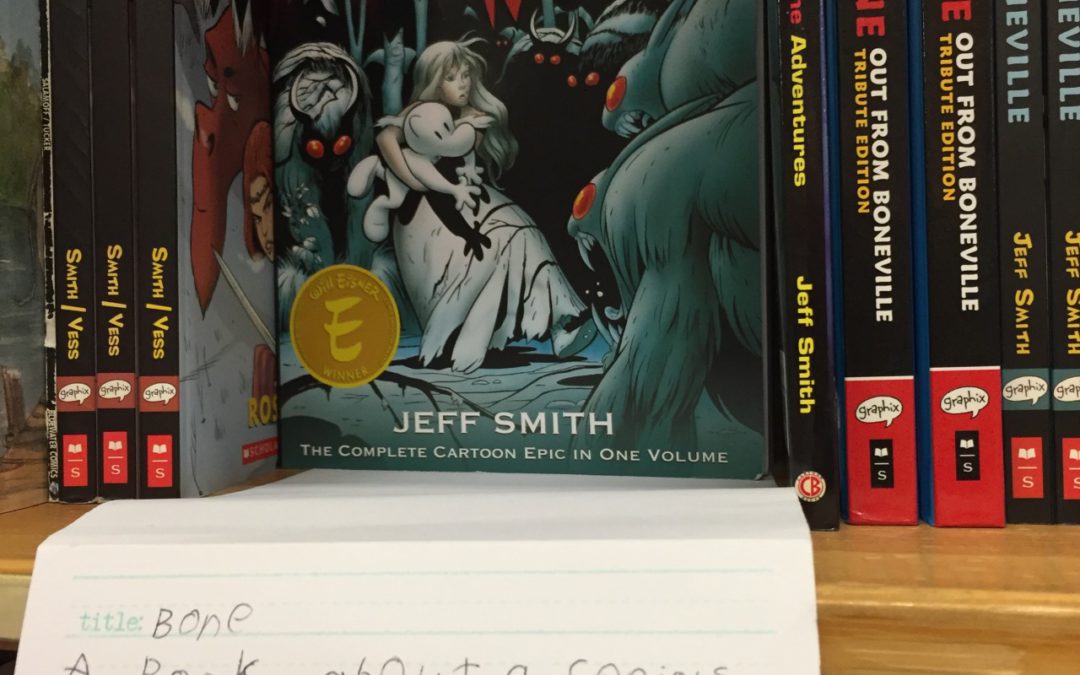 From Powell’s Books in Portland, an astute review from Carson, age 9.#BONE25 #CODA #jeffsmith #bonecomics #boneville #fonebone #phoneybone #smileybone #rasl #tukisavethehumans
