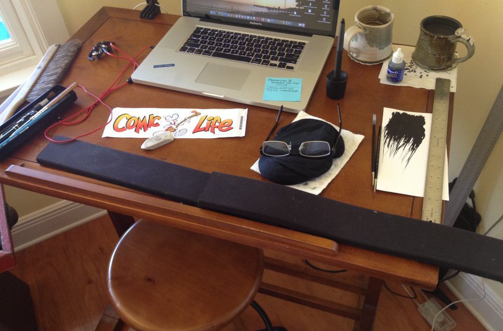 My mini-desk setup down in Key West, where I’ve been working on a secret project for the past few months. #BONE25#BONE25#bonecomics#boneville#jeffsmith#fonebone#phoneybone#smileybone#RASL#tukisavethehumans