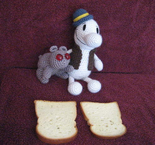 Crocheted Smiley and Bartleby making blank sandwiches! This is too much! Fabulous work Amber555!Find more crocheted Bone greatness here: http://www.craftster.org/forum/index.php?topic=267701.0