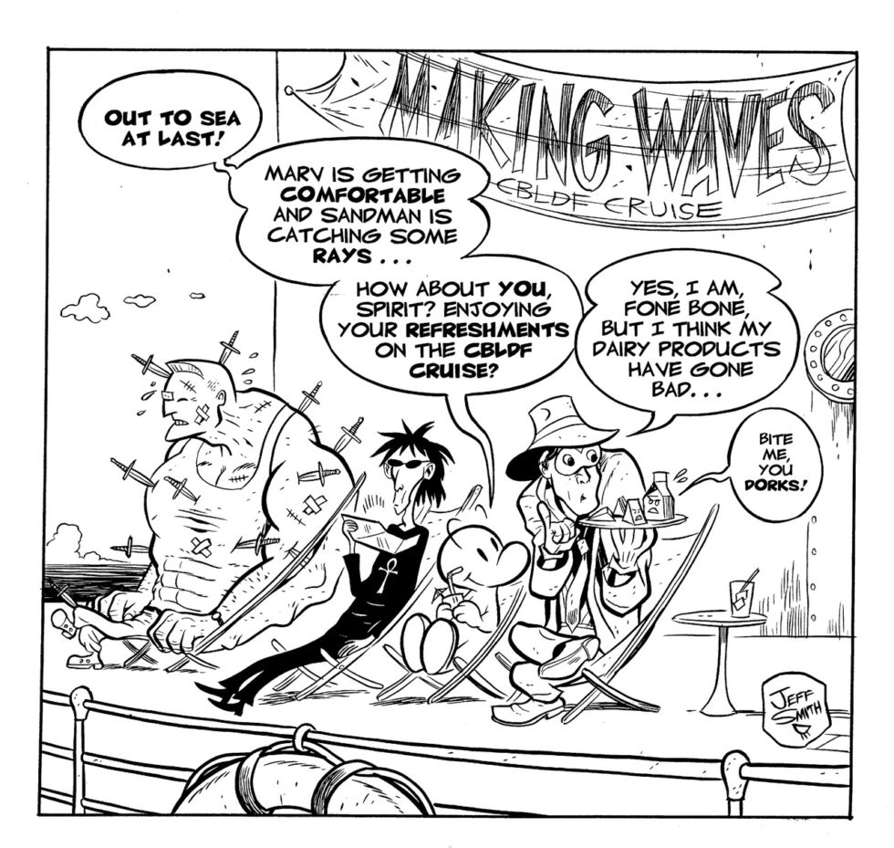 A colored, oversized (6” x 3”) update to the original flipbook released in 1994, features a scene right out of The Great Cow Race animated by the great Disney animator and Director Tom Bancroft, with clean up drawings by famed Monsters Beware graphic novelist Raphael Rosado. The flipbook has now been colored for the first time by Tom Gaadt! Watch the Stupid Rat Creature chase Fone Bone over and over!